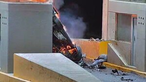 - En una camioneta chocaron contra una caseta de la Puerta de Acceso Oriente y se incendió al regresar a sus domicilios tras asistir a un baile