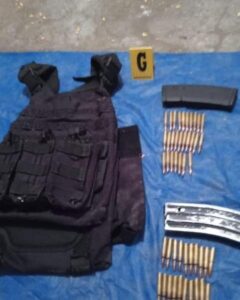 Los policías estatales aseguraron el Kia y en su interior encontraron tres armas de fuego largas, dos de ellas calibre .223, rifles de asalto AR-15, y una calibre 7.62, rifle de asalto AK-47 (“cuerno de chivo”), tres chalecos tácticos y un chaleco con tres cargadores calibre 7.62 y dos para .223, todos abastecidos.