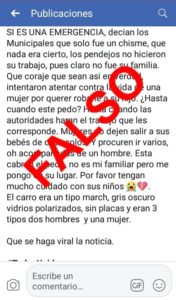 AGUASCALIENTES, AGS.- Referente a la información que circula por medio de whatsapp, en la que una persona de sexo femenino supuestamente fue agredida físicamente por tres sujetos que intentaron arrebatarle a su bebé en el fraccionamiento La Ribera del municipio de San Francisco de los Romo, la Secretaría de Seguridad Pública del Estado informa que es FALSA.