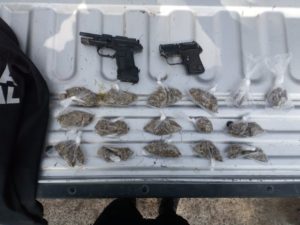Al continuar con la revisión, le encontraron otra arma, ésta de plástico y 16 envoltorios con mariguana que dieron un peso bruto de 140 gramos, los cuales fueron asegurados.