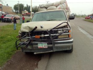 Los hechos se registraron la mañana del viernes, cuando José Luis de 32 años de edad, conducía una camioneta Chevrolet pick up, color dorado con placas de Zacatecas, la cual llevaba un remolque con varios costales con alimento para ganado, desplazándose de norte a sur sobre la carretera 71 que conduce a Luis Moya.
