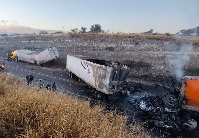 AGUASCALIENTES, AGS.- Un chofer muerto calcinado y otro lesionado de gravedad fue el saldo que dejó un choque frontal y posterior incendio entre dos tráileres en el Libramiento Poniente; un tercer camión de carga se vio involucrado en el percance al abandonar la carretera por evitar colisionar contra los otros dos.
