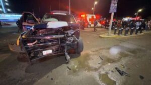 Al transitar por la referida vialidad el vehículo oficial, con su parte frontal, impactó el costado derecho de una camioneta GMC, por lo que una mujer que viajaba como copiloto quedó atrapada en la cabina ya que la puerta no se podía abrir.