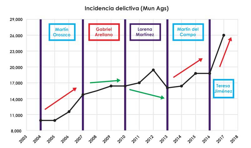 Para los mismos periodos de tiempo, la incidencia en el municipio de Aguascalientes no obedece a los cambios ocurridos a nivel nacional, pues como lo muestran estos datos, en las administraciones panistas, el efecto se magnifica para mal; es decir, si a nivel nacional aumenta en “X” porcentaje la incidencia, para ese mismo periodo el porcentaje aumenta en una cantidad mucho mayor en Aguascalientes.