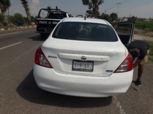 Los hechos se registraron alrededor de las 11:35 horas, cuando los oficiales realizaban sus labores de vigilancia por la carretera estatal 20, cuando en determinado momento se percataron de la presencia de un vehículo marca Nissan Sentra blanco, modelo 2012 con placas de circulación X14AVJ, de la Ciudad de México, el cual tenía los vidrios polarizados.