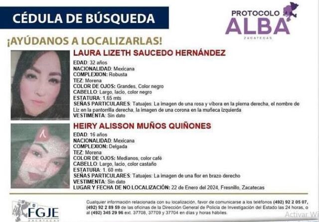 Por su parte, en la zona Centro de Fresnillo desaparecieron Heyri Alisson Muños Quiñones, de 16 años de edad, y Laura Lizeth Saucedo Hernández, de 32 años de edad.