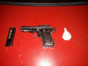 Al realizarles una inspección corporal, no se les encontraron objetos ilícitos, sin embargo al revisar el vehículo, los policías encontraron en medio de los asientos delanteros, una pistola tipo escuadra calibre .22 cromada y con cachas de madera color café con un cargador abastecido con 10 cartuchos útiles, así como un envoltorio en color transparente que contiene en su interior 7 gramos de crystal.