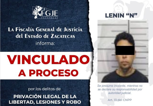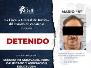 En un primer evento se logró la detención, en el municipio de Zacatecas, de Lenin “N”, sujeto que es investigado por su presunta participación en el delito de privación ilegal de la libertad, lesiones y robo, lo anterior, por un hecho registrado en el pasado mes de agosto.