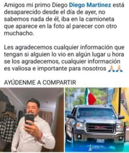 De Diego, sus allegados informaron que conducía una camioneta GMC e iba acompañado del otro joven, mientras que de Luis Ángel señalaron que lo vieron por última vez en las cabañas del Maguey.