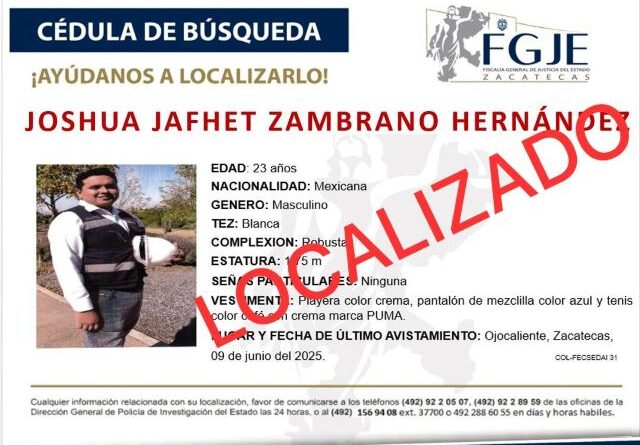 ZACATECAS, ZAC.- Las fuerzas de seguridad localizaron con vida a Joshua Zambrano Hernández, quien había sido reportado como desaparecido desde el 9 de junio; se trata del hijo del presidente municipal de Ojocaliente, Juan Manuel Zambrano Jiménez.