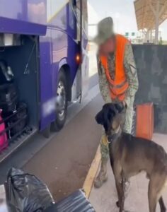 El registro al autobús se llevó a cabo con apoyo de un binomio canino, que al olfatear el compartimento del equipaje marcó una maleta en color negro, que fue apartada del resto.