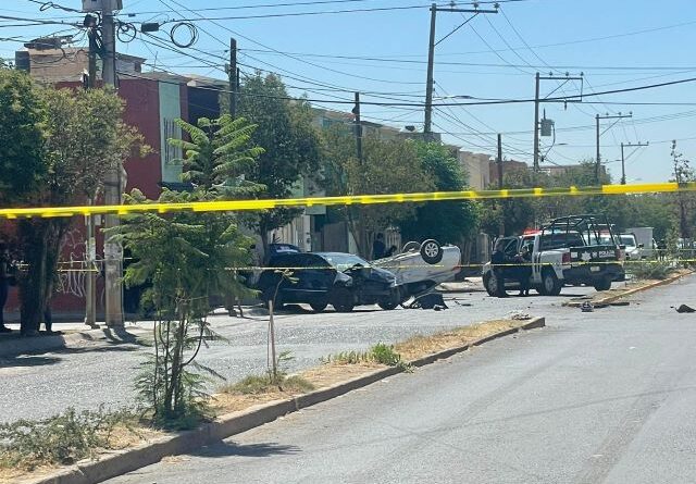 GUADALUPE, ZAC.- Delincuentes balearon la fachada de un domicilio y al escapar en un vehículo chocaron contra otro tripulado por una familia y lo volcaron, por lo que una mujer y un niño resultaron lesionados.