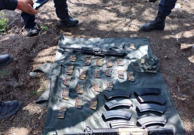 Al inspeccionar tal asentamiento, localizaron un arma R-15 y un arma AK-47, así como ocho cargadores para armas de fuego y 200 cartuchos útiles de diferentes calibres.