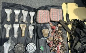 Al darles alcance y realizarles una inspección física se detectó que se encontraban en posesión de nueve artefactos explosivos, 1 mil 470 cartuchos calibre .223, dos cargadores de disco, un chaleco balístico, siete cinturones tácticos, dos pares de rodilleras tácticas y 50 dosis de una sustancia granulada con características de la droga conocida como metanfetamina.