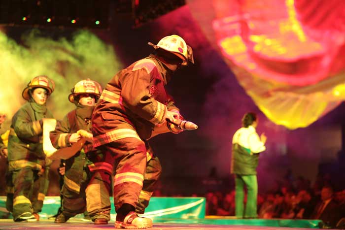 Las luces se apagaron para dar paso al flashmob (participación de personas en una determinada acción en este caso un show de luz y sonido) titulado “Un día en tu Municipio” en el que participaron más de 100 actores profesionales y niñas y niños integrantes de las Unidades de Exploración Artística (UEA´S) del Instituto Municipal Aguascalentense para la Cultura (IMAC) y de distintas compañías de danza locales, representando a servidores públicos que todos los días hacen de Aguascalientes un lugar mejor, de áreas como Limpia y Aseo, quienes bailaron con escobas brillantes haciendo alusión a la “Escoba de Platino”, premio que reconoce a Aguascalientes como una de las ciudades más limpias de Latinoamérica; de Seguridad Pública simbolizando a nuestros policías y a nuestros héroes, los Bomberos que día a día dan lo mejor de sí para cuidar a las personas, salvarles la vida si es necesario incluso exponiendo la propia y para que el municipio de Aguascalientes siga siendo un ejemplo a nivel nacional e internacional.