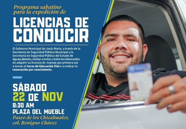 JESÚS MARÍA, AGS.- Este sábado 22 de noviembre la Plaza del Mueble ubicada sobre Paseo de los Chicahuales, en la colonia Benigno Chávez, será sede de la jornada especial para la gestión de licencias de conducir, organizada por el Gobierno Municipal de Jesús María en colaboración con la Secretaría de Seguridad Pública y Vialidad Municipal y la Secretaría de Seguridad Pública del Estado.