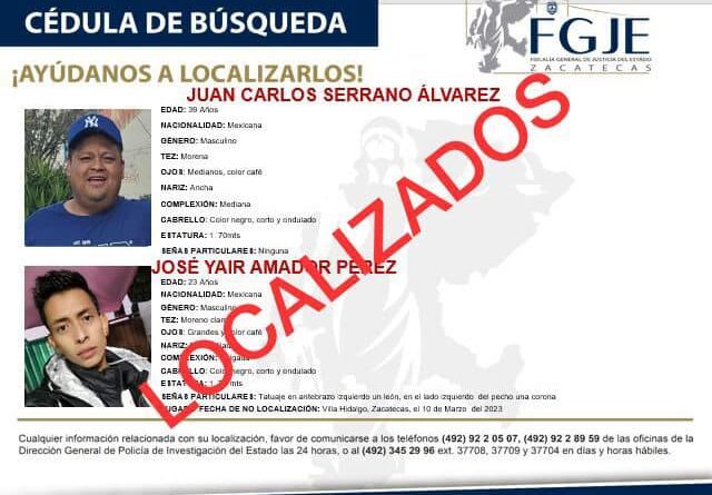 AGUASCALIENTES, AGS.- La Fiscalía General de Justicia del Estado de Zacatecas (FGJEZ) confirmó la localización de los dos comerciantes originarios de Aguascalientes y que habían desaparecido en el municipio de Villa Hidalgo, Zacatecas, a donde habían acudido a comercializar productos en distintas tiendas de abarrotes a bordo de una camioneta.