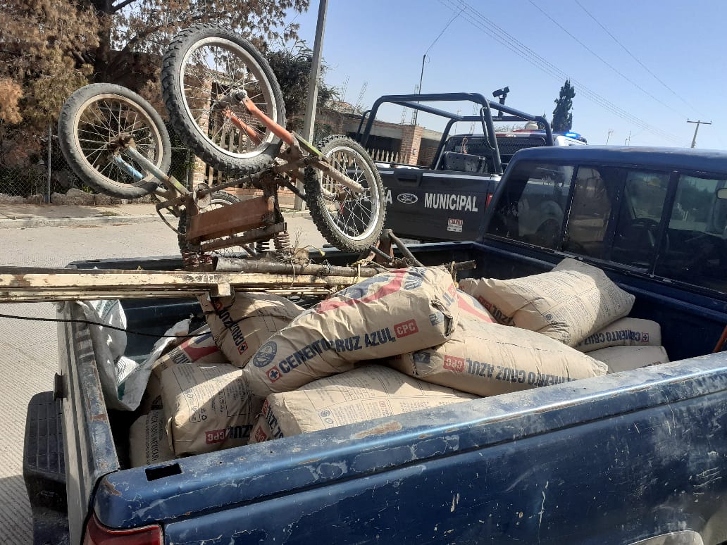 Conociendo lo anterior, policías estatales y municipales recorrieron la zona y metros adelante en la misma comunidad, detectaron a dos individuos que llevaban en su poder 20 sacos de cemento así como la carreterilla, los cuales fueron plenamente identificados por el propietario de la finca en construcción.