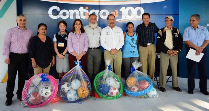 Finalmente en la premiación el Gobernador del Estado entregó un kit deportivo a los directores cada institución educativa, el cual se conforma por balones de básquetbol, futbol y voleibol, aros y conos; así mismo cada equipo ganador recibió un trofeo y reconocimiento por la participación en el programa “Contigo al 100”.