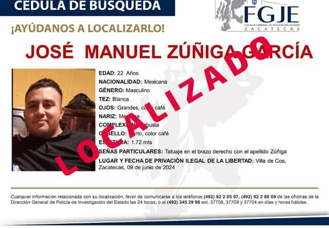 VILLA DE COS, ZAC.- La Fiscalía General de Justicia del Estado (FGJEZ) confirmó que fue localizado con vida el elemento de la Policía capitalina que había sido privado de su libertad.