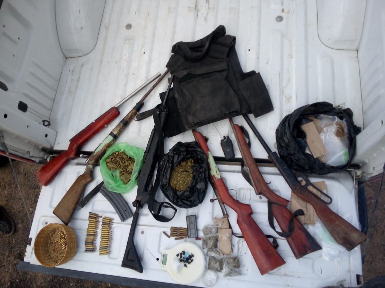 En las maletas deportivas, fueron aseguradas seis armas largas, tratándose de una Ruger Mini-14 calibre .223 y 5 calibre .22, así como 12 cartuchos calibre .30, un cargador calibre .30, 40 cartuchos de .223, 24 cartuchos calibre .22, 1 cargador con capacidad para 40 cartuchos calibre .223, un radio de comunicación y un chaleco balístico.