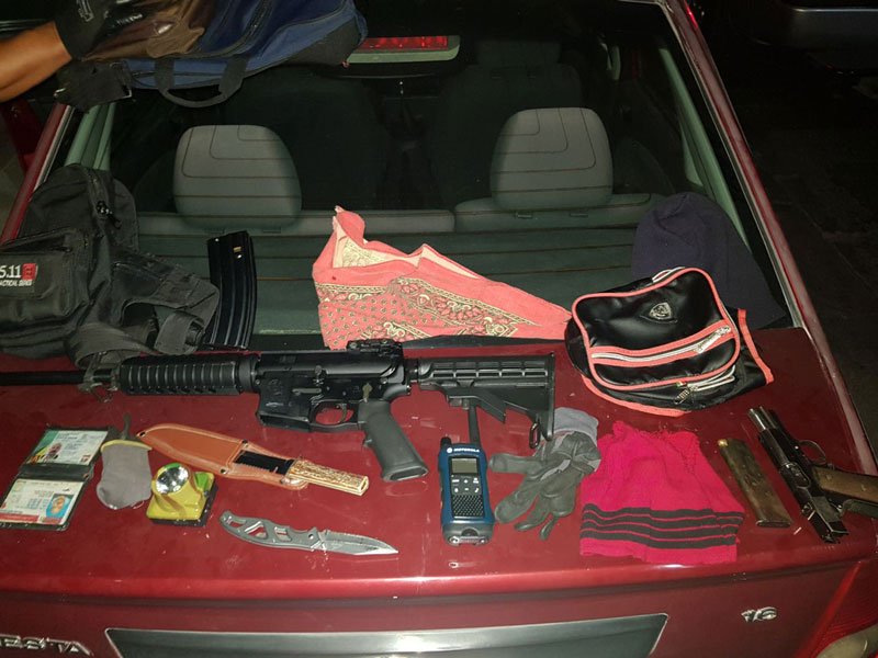 Tambien fue detectada una navaja en color gris de aproximadamente 12 centímetros de hoja, un cuchillo de aproximadamente 30 centímetros de hoja con mango de madera en una funda de color café, dos pasamontañas de tela, uno en color rojo y otro en color negro, una linterna, un paliacate en color rojo con amarillo y un par de guantes de tela.