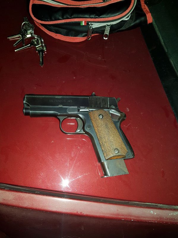 Por lo anterior al proceder a su revisión a quien dijo llamarse José Juan N de 28 años le detectaron entre sus ropas un arma de fuego corta tipo escuadra de la marca Detonics calibre .45 mm con cachas en color café con un cargador de la marca Colt abastecido con 7 cartuchos útiles.