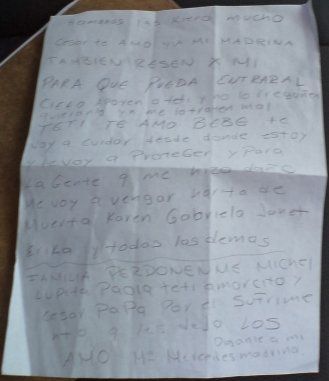“Hermanas las kiero mucho Cesar te AMO y A MI MADRINA TAMBIEN RESEN X MI PARA QUE PUEDA ENTRAR AL CIELO Apoyen a teti y no lo rregañen quieranlo y n me lo traten mal TETI TE AMO BEBE te voy a cuidar desde donde estoy y te voy a ProteGer y Para La Gente q me hizo daño Me voy a vengar hasta de Muerta Karen Gabriela Janet Erika y todas las demas FAMILIA PERDONENME MICHel LuPita Paola teti amorcito y Cesar PaPa Por el SuFrimento q les dejo LOS AMO Ma. Mercedes Diganle a mi madrina…”.