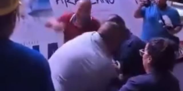 Algunos integrantes de los equipos de campaña de los candidatos intentaron alejar a los 2 manifestantes y se generó una confrontación, en la que intervinieron elementos de la Policía Preventiva.