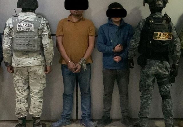 Los detenidos fueron identificados como Luis Miguel “N”, de 36 años de edad, originario de Tabasco, y Lázaro Salomón “N”, de 20 años, de Zacatecas, quienes junto con el arma, las dosis de droga, las municiones y demás evidencias recolectadas durante la detención, fueron puestos a disposición de las autoridades correspondientes.