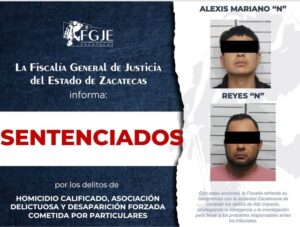ZACATECAS, ZAC.- El equipo de investigación adscrito a la Fiscalía Especializada en Delitos de Alto Impacto obtuvo sentencia condenatoria mediante juicio oral en contra de Alexis Mariano “N”, José Benjamín “N”, José Luis “N” y Reyes “N”, por los delitos de homicidio calificado, asociación delictuosa y desaparición forzada cometida por particulares, con penas que van de los 59 a los 75 años de prisión, además de la reparación integral del daño a los familiares de las víctimas.