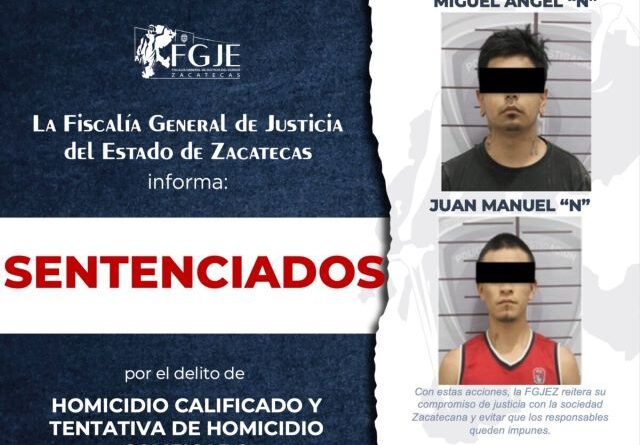 ZACATECAS, ZAC.- La Fiscalía General de Justicia del Estado (FGJE) informó que obtuvo sentencia condenatoria de 93 años y cuatro meses de prisión en contra de Miguel Ángel “N” y Juan Manuel “N”, quienes fueron declarados responsables por los delitos de homicidio calificado y tentativa de homicidio calificado en perjuicio de seis personas, en Fresnillo.