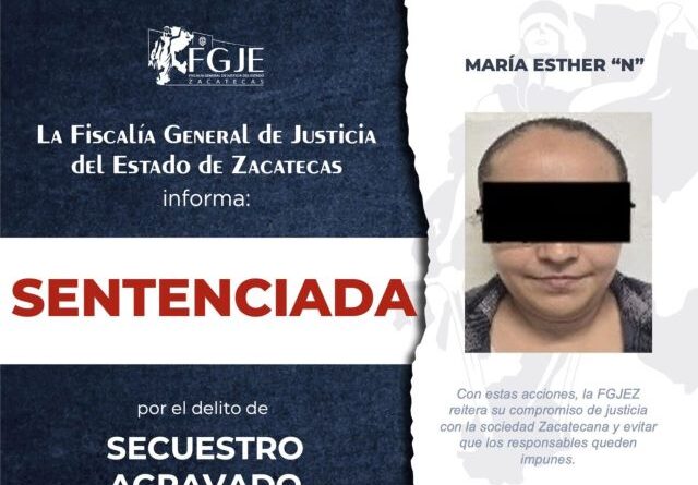 ZACATECAS, ZAC.- El equipo de investigación adscrito a la Fiscalía Especializada en Delitos de Alto Impacto, obtuvo sentencia condenatoria mediante juicio oral en contra de María Esther “N” por el delito de secuestro agravado consistente en 100 años de prisión y reparación integral del daño.