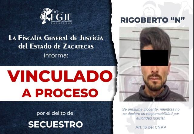 ZACATECAS, ZAC.- El equipo de investigación adscrito a la Fiscalía de Alto Impacto logró la vinculación a proceso por el delito de secuestro en contra de Rigoberto “N”, a quien se le impuso medida cautelar de prisión preventiva.