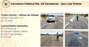 Precisó que en la carretera 49 a San Luis Potosí hay un tramo de 19 kilómetros de bastantes baches, mientras que en la carretera 54 a Saltillo hay 2, uno de 15 y otro de 18.