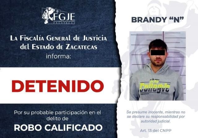 FRESNILLO, ZAC.- La Fiscalía General de Justicia del Estado de Zacatecas dio a conocer que en una acción coordinada entre corporaciones de seguridad, Ejército Mexicano, Guardia Nacional, CONASE, Policía Estatal, Policía Municipal de Fresnillo y Policía de Investigación, se llevó a cabo la detención de Brandy “N”, quien cuenta con orden de aprehensión por el delito de robo calificado.