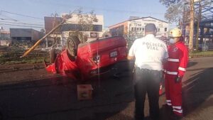 El coche se estrelló contra dos árboles y una malla ciclónica para finalmente volcarse y quedar recostado sobre su toldo.
