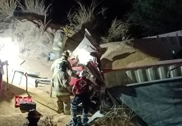 AGUASCALIENTES, AGS.- Un trailero murió tras de que cayó a un desnivel y la carga de grano que transportaba cayó encima de la cabina.