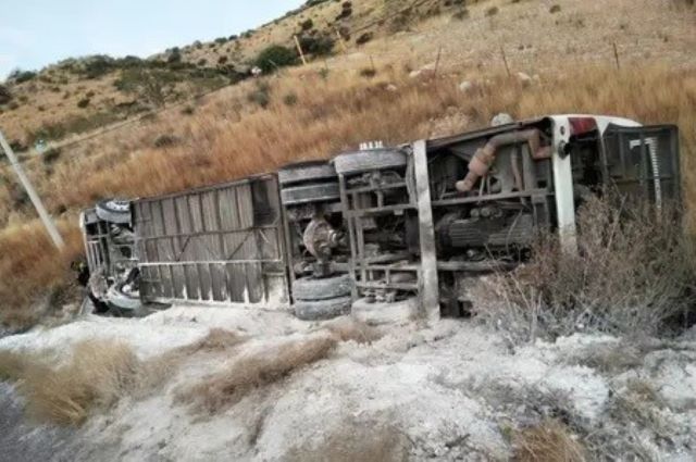 AGUASCALIENTES, AGS.- Un autobús de pasajeros que salió de la Ciudad de México con destino a Aguascalientes sufrió una aparatosa volcadura en la carretera federal 70 Oriente, a la altura de la conocida curva de la “M”, por lo que 40 personas, la mayoría invidentes, resultaron lesionadas, aunque ninguna de gravedad.