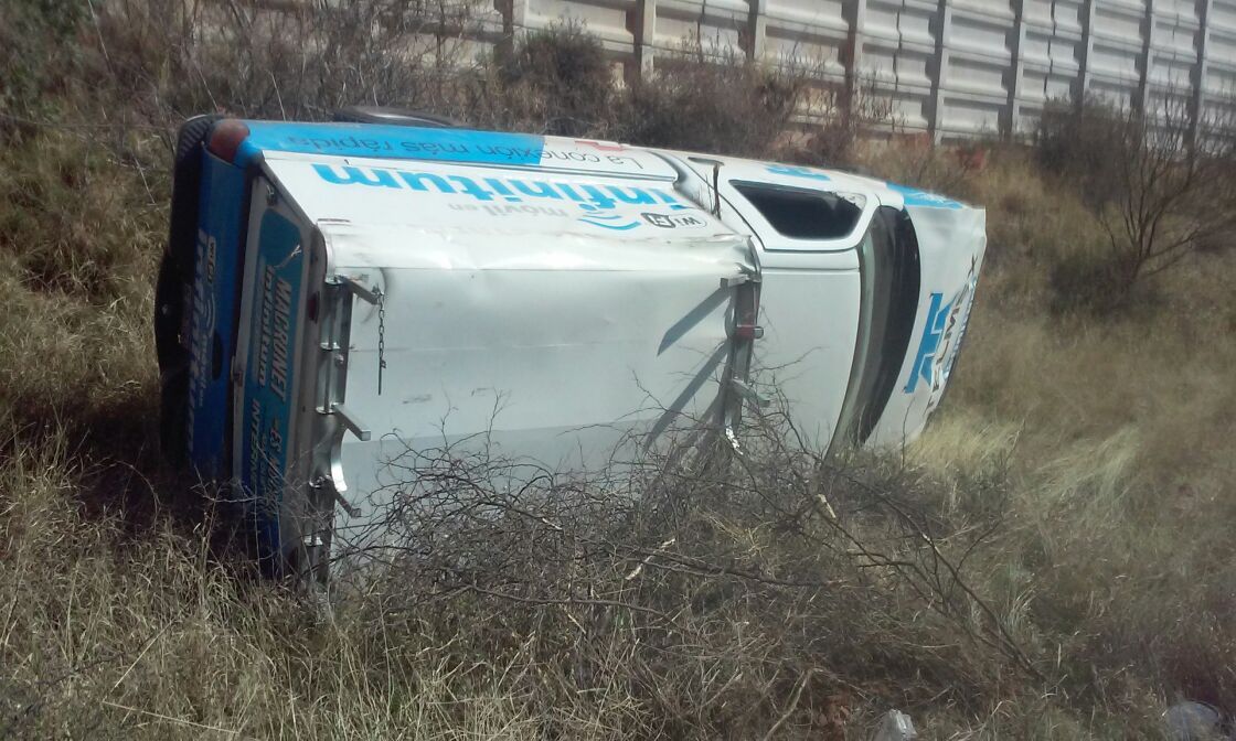 COSIO, AGS.- En el Municipio de Cosío, sobre la carretera 45 federal a la altura del kilómetro 50 + 400, se registró una volcadura en la que una camioneta de la empresa Telmex, quedó volcada sobre su lado derecho, mientras que el conductor resultó ileso.