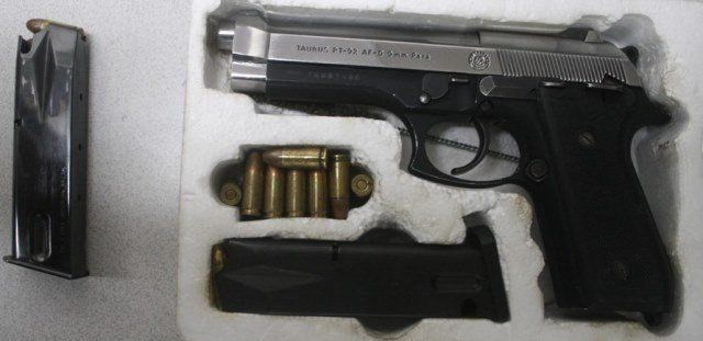 Al revisar la camioneta, bajo el asiento del conductor hallaron una caja de unicel que contenía 18 cartuchos útiles calibre 9 milímetros y bajo el asiento del copiloto un arma de fuego escuadra marca Taurus del mismo calibre con un cargador con seis cartuchos útiles.